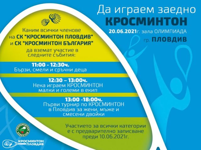 Първи турнир по кросминтон в Пловдив – “Да играем заедно КРОСМИНТОН” – 20.06.2021г. Новини, Събития, ТурнириBy ivo17.06.2021Да играем заедно КРОСМИНТОН на 20.06.2021г.